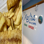 Marina Fish and Chips specializes in traditional fish and chips, along with various side dishes, burgers, sausages, and chicken. It offers a wide variety of options including battered king prawns and vegetarian sausages.