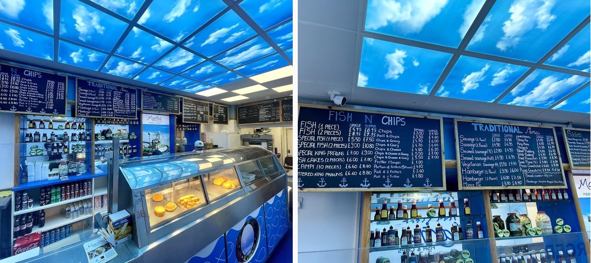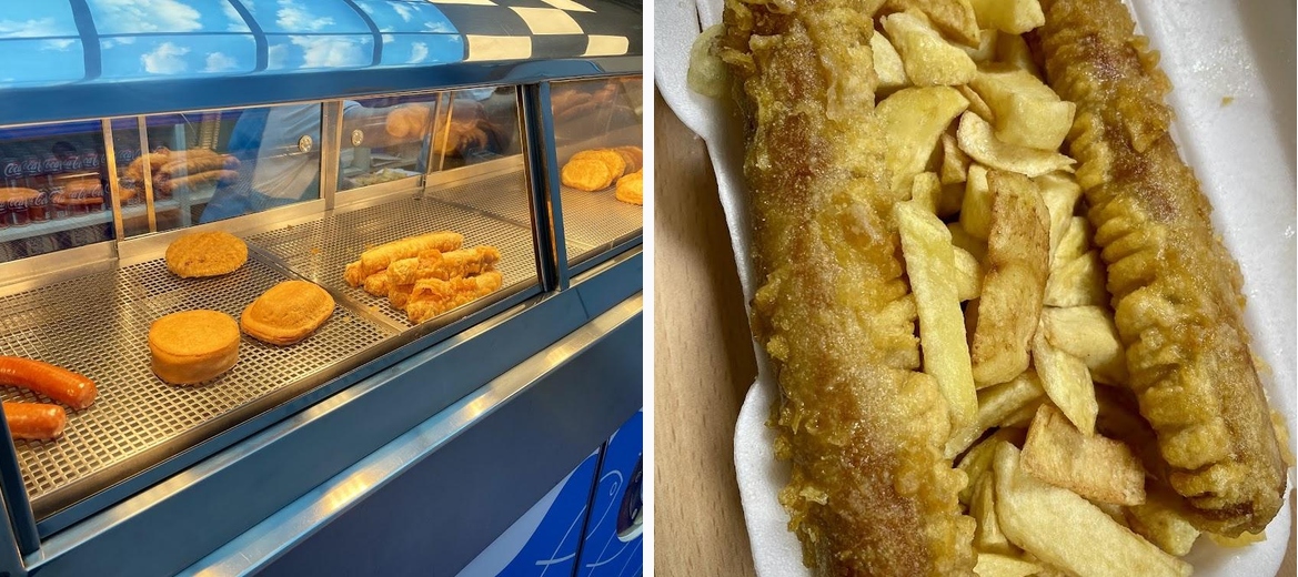 Popped in on a weekday lunchtime for some saturated sustenance. The interior decor is surprisingly fancy for your local humble chippie. Definitely smarter than your average and nice clear menus all spotlessly clean. Sausage supper was a massive portion and the chips were great. Can’t fault it. Lunch menu isn’t the cheapest in town but was great value for the quality. I’ll definitely be back.
